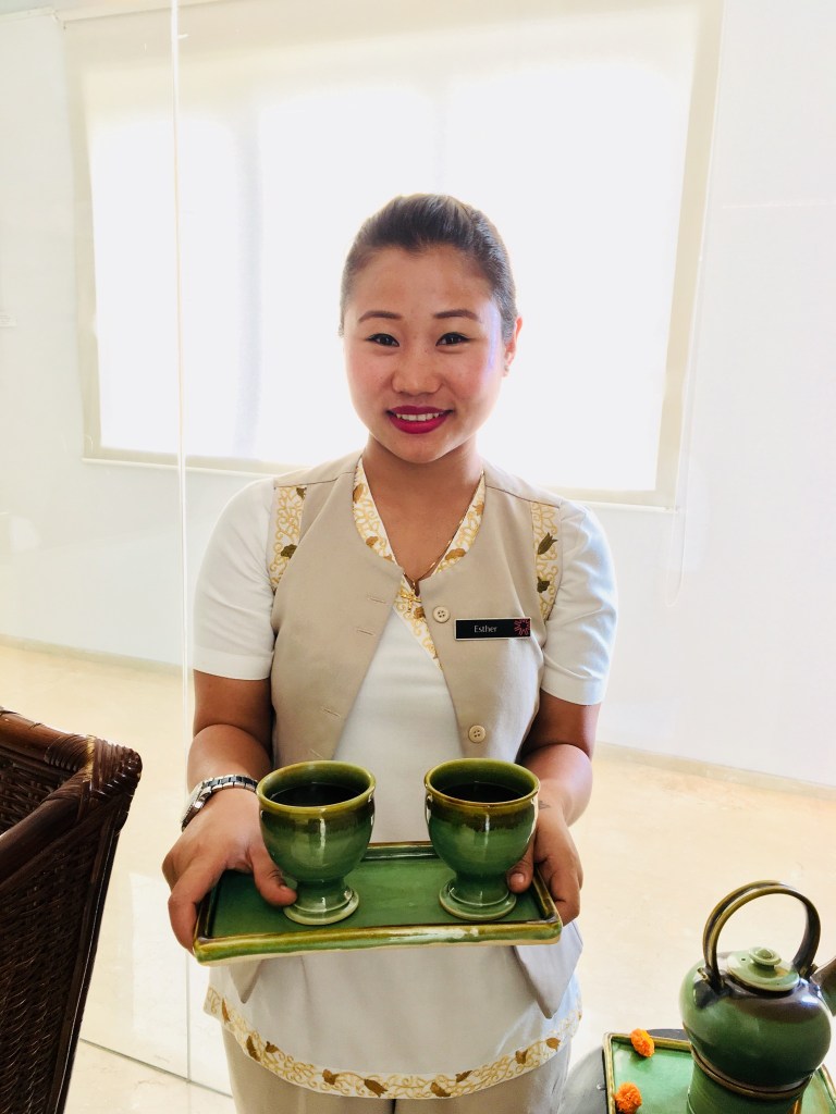 My tour included of one of the Deluxe Delight Rooms on the 6th floor. It had all standard amenities that you expect of a luxury hotel. The rooms boast of traditional carved wooden and bamboo furniture, royal interiors, abundantly stocked mini-bar, sleek workspace and picturesque hill and pool views. Can anything get better than this? (yes a week long stay!….on my wish list) I loved everything from the textured walls, to the elegant bed linens, everything was masterfully styled with motifs that symbolise the Ahom dynasty and is a beautiful amalgamation/confluence of all Northeastern tribes and generations. The perfect blend of modern with traditional roots.