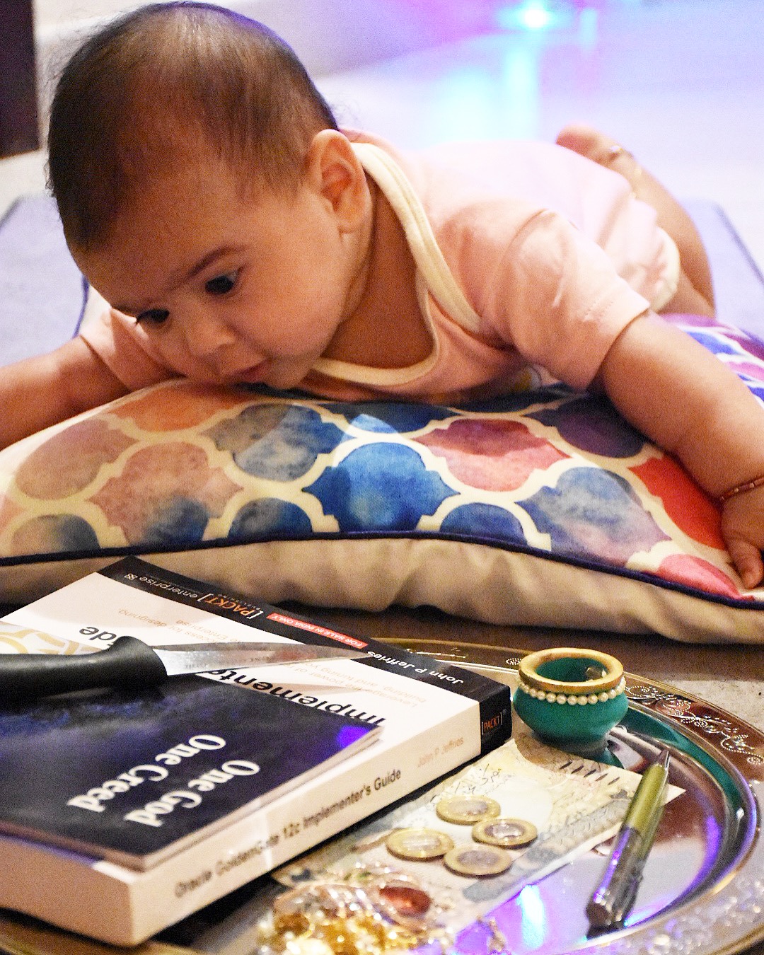 It is believed that the object a baby picks up from the plate represents his/her area of interest in future. In our case, she picked the book and pen at the same time with both her hands.