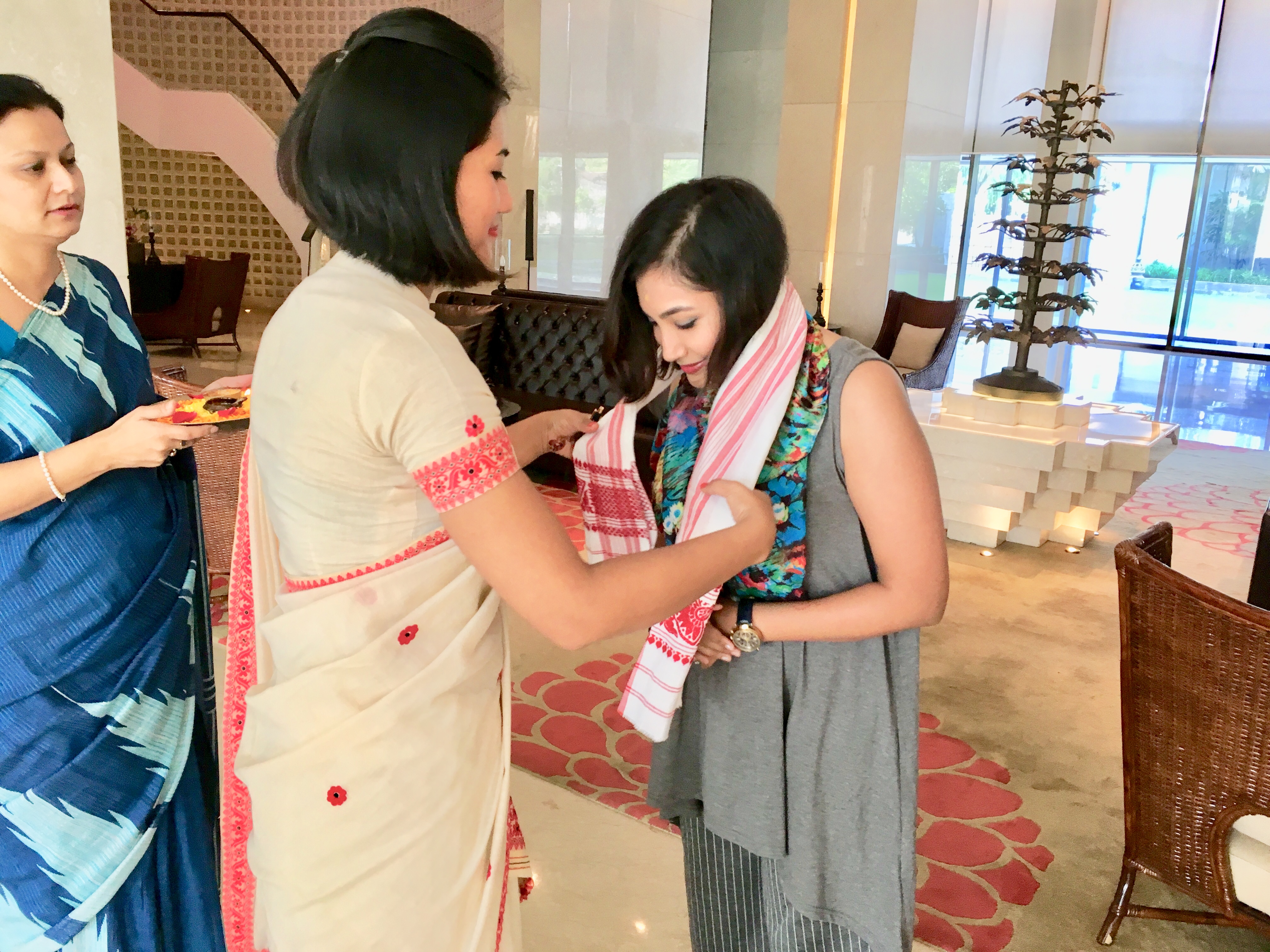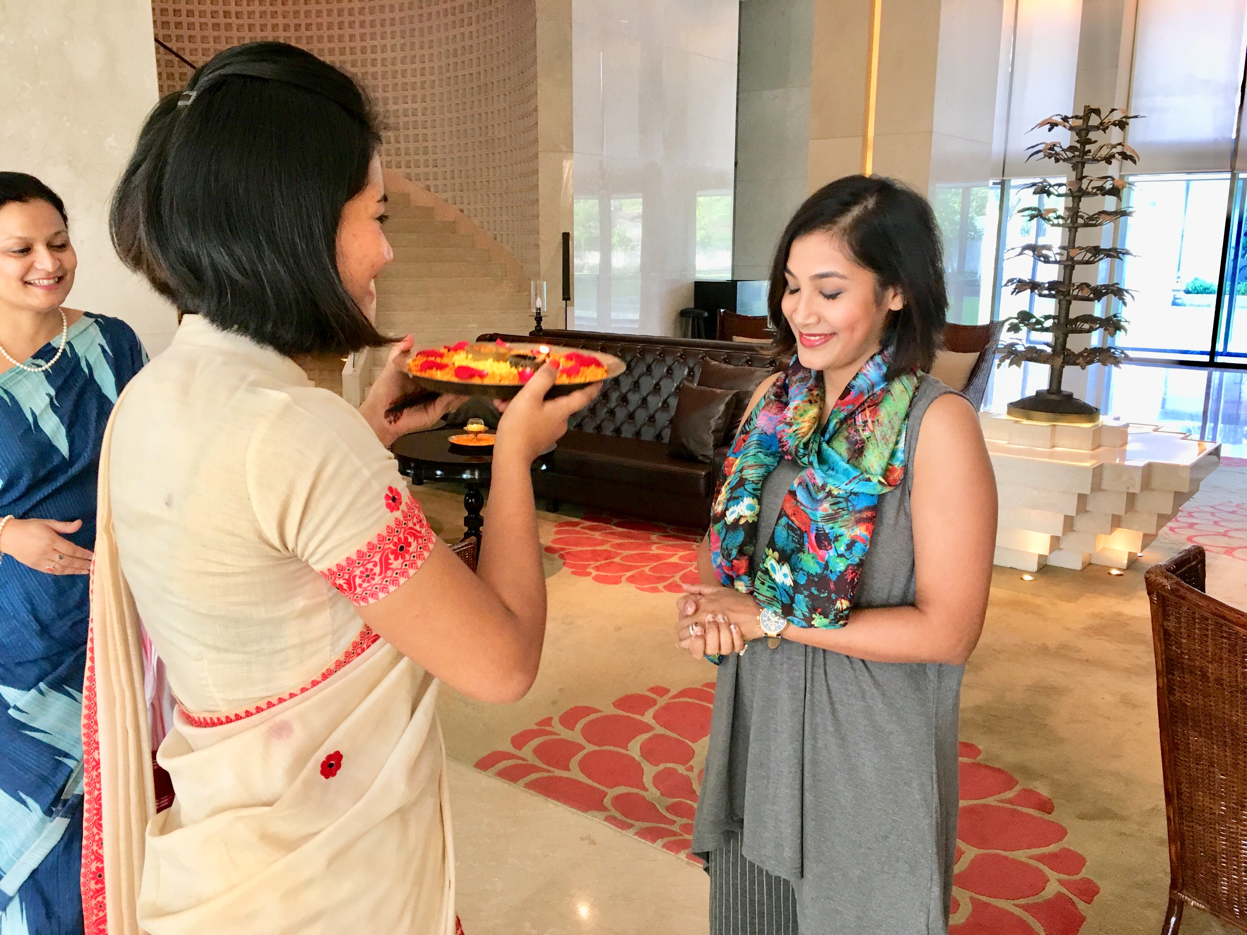 I visited the hotel on the very busy Saturday afternoon. Upon arrival, I was welcomed with the offering of a Gamusa/Gamosa/Gamocha (a white hand-woven piece of cloth of cotton or silk, with red woven patterns or motifs on two sides and red stripes on the long border) that holds a unique identity of the Assamese Society and the trademark aarti, tikka of a Taj Hotel.